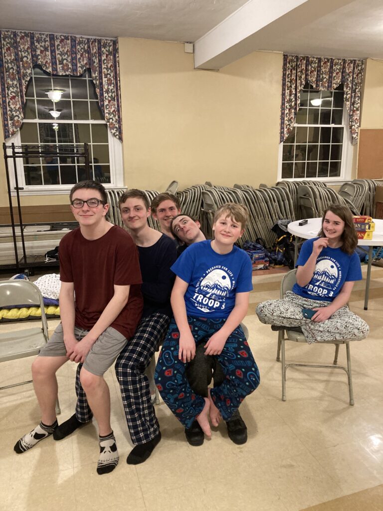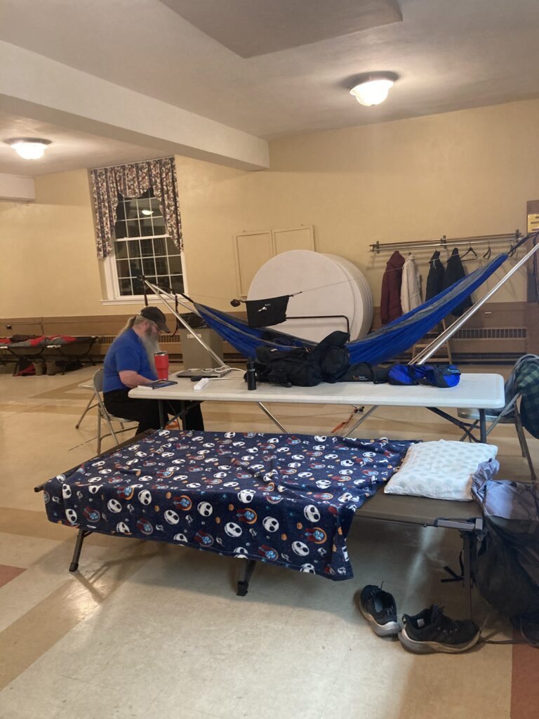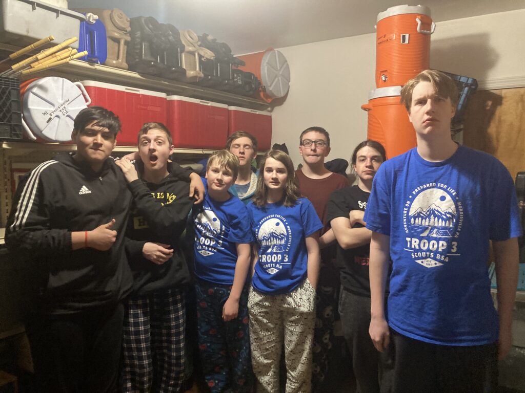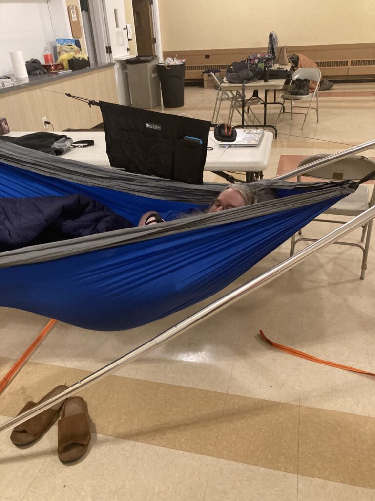 One of Troop 3’s favorite events each year is the Troop Lock-In. During this event, Scouts kick back and spend the weekend with good food, gaming, and just hanging out. Our lock-in is held in Fellowship Hall, so everyone sets up camp around the perimeter of the room. Mr. Huston decided that hammock camping is just for at camp. We are genuinely surprised that Mr. Chris didn’t take this as a challenge and set up his hammock as well.